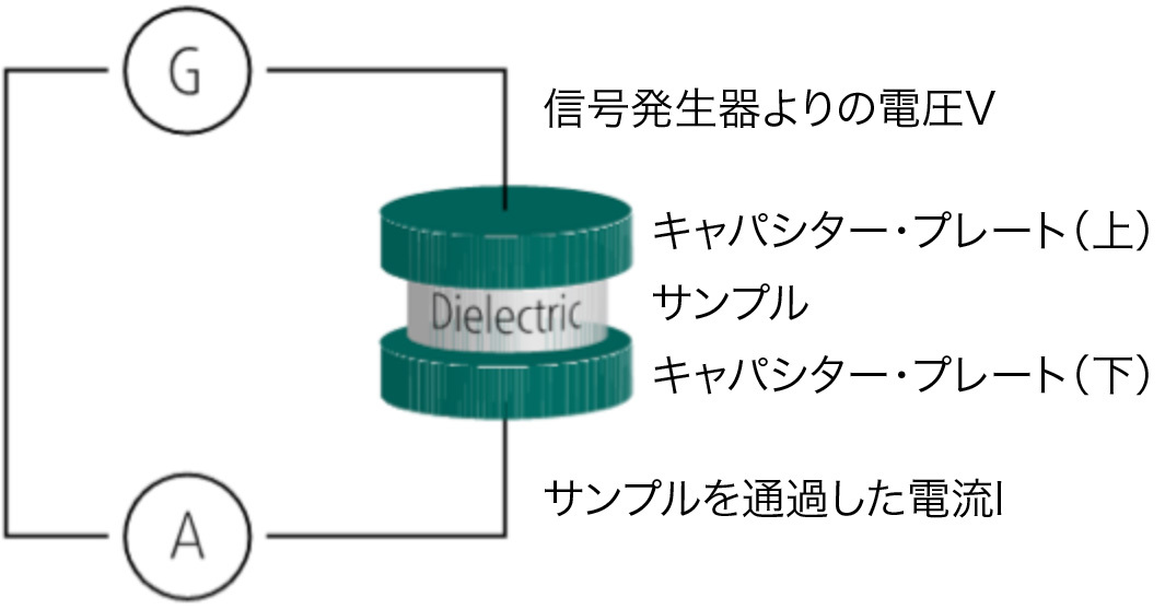交流電場の印加により、プレート間に挟まれたサンプル(例:エラストマーなど)は誘電体となり、サンプルを通過する交流電流が測定されます。