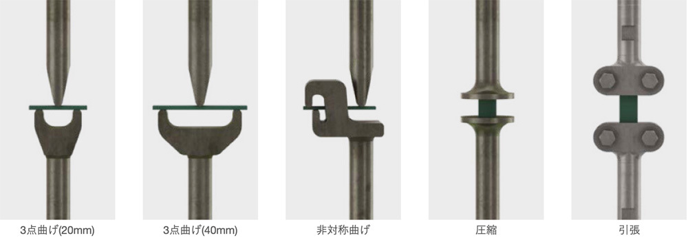 ホルダーの交換のみで「せん断」・「引張」・「圧縮」・「曲げ」などの複数の測定モードに対応します。また、特殊ホルダーのカスタム製作も承ります。